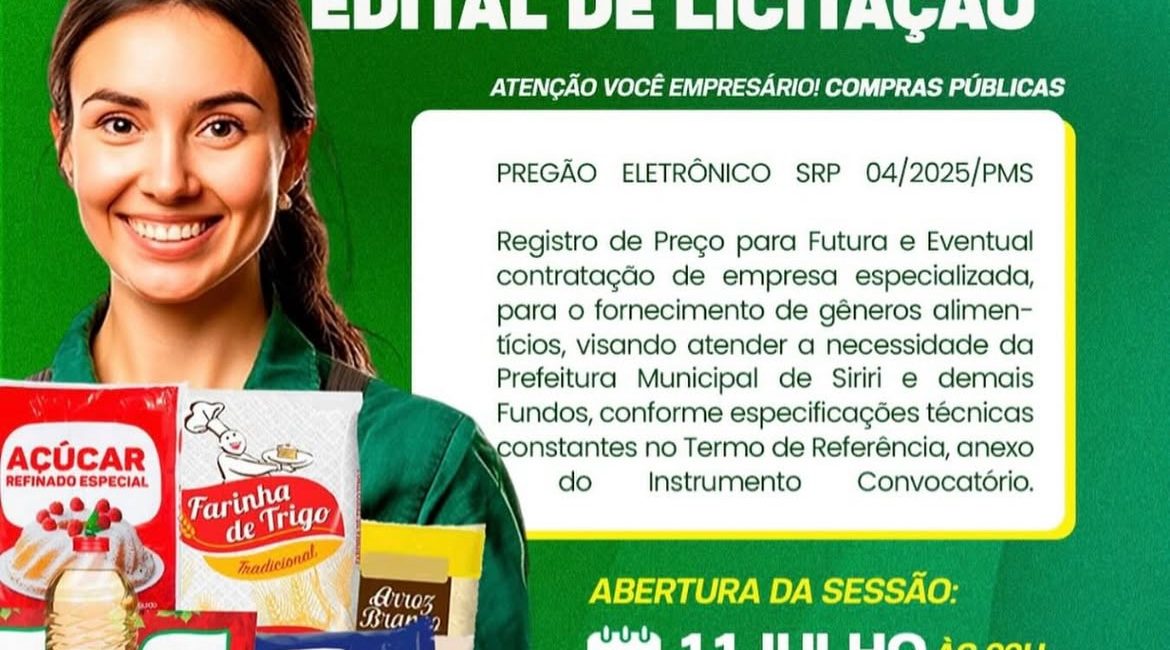 A Prefeitura Municipal de Siriri informa aos empresários e fornecedores interessados que está aberto o Pregão Eletrônico SRP nº 04/2025, com o objetivo de registrar preços para futura e eventual contratação de empresa especializada no fornecimento de gêneros alimentícios. A contratação visa atender às demandas da administração municipal e...
